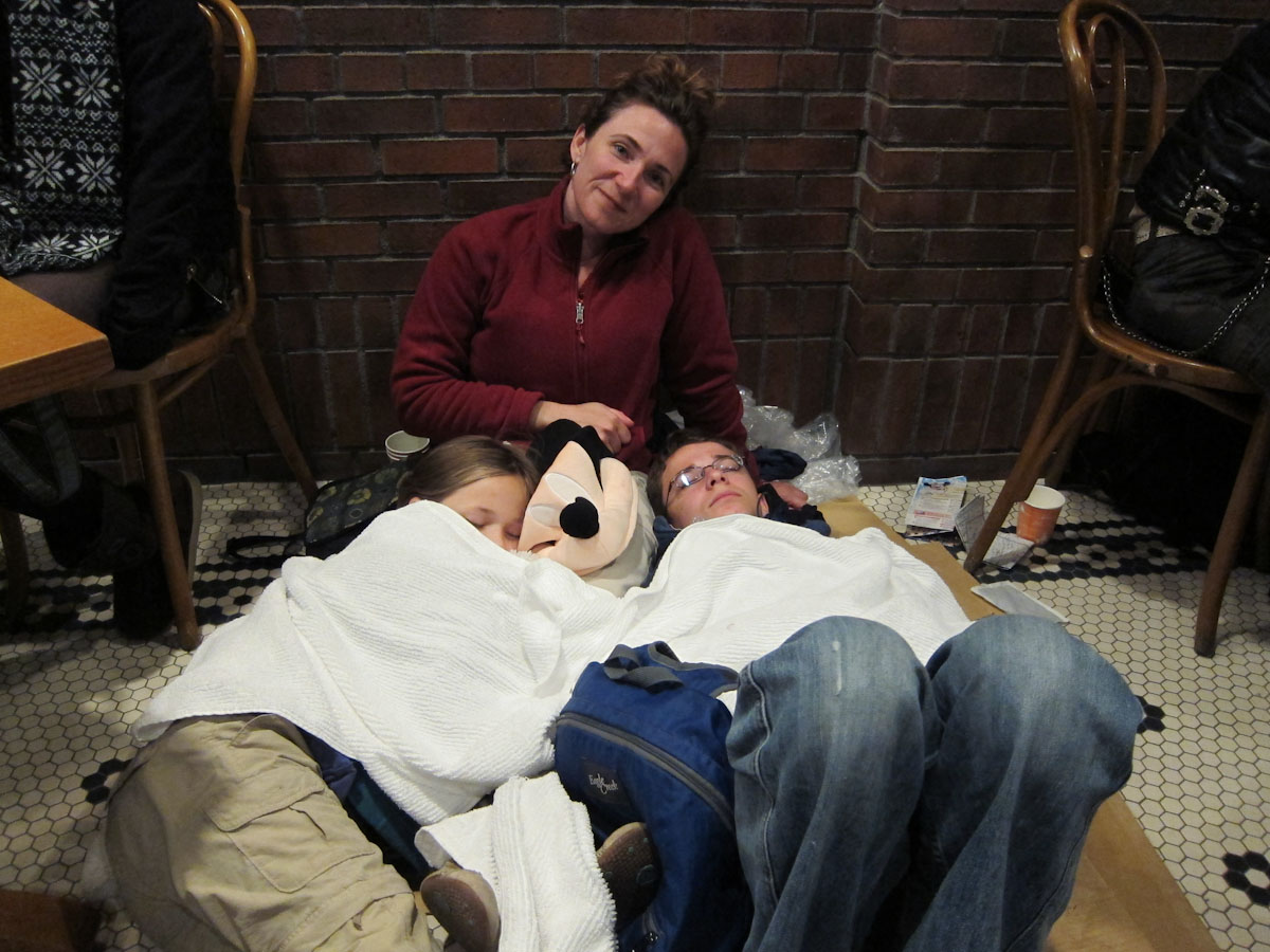 Eventually Dad switched to a chair, and Mom, Katherine and I all spent the night on the mat. Dad stayed in the chair the entire night, like sleeping on a plane.