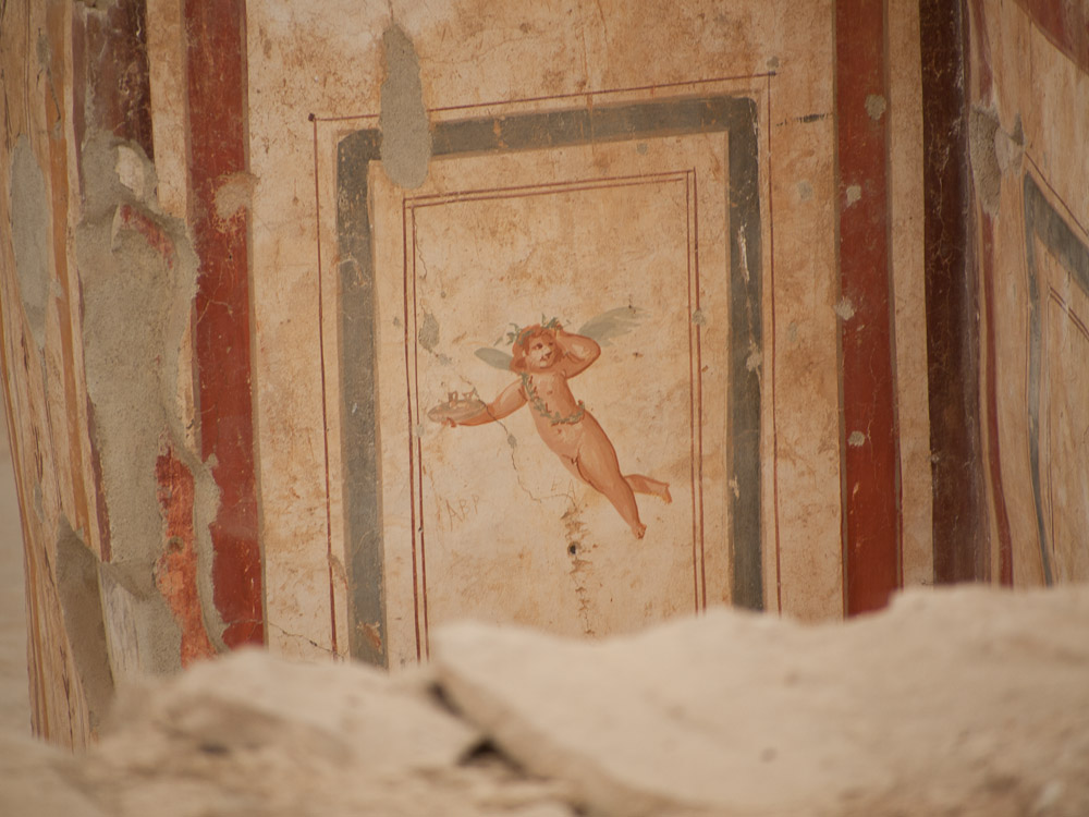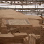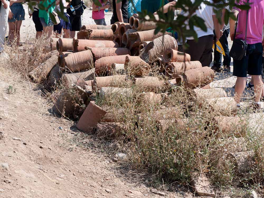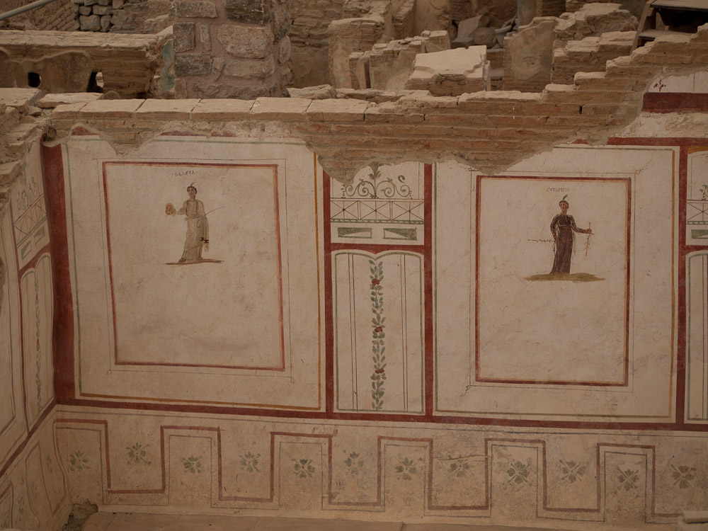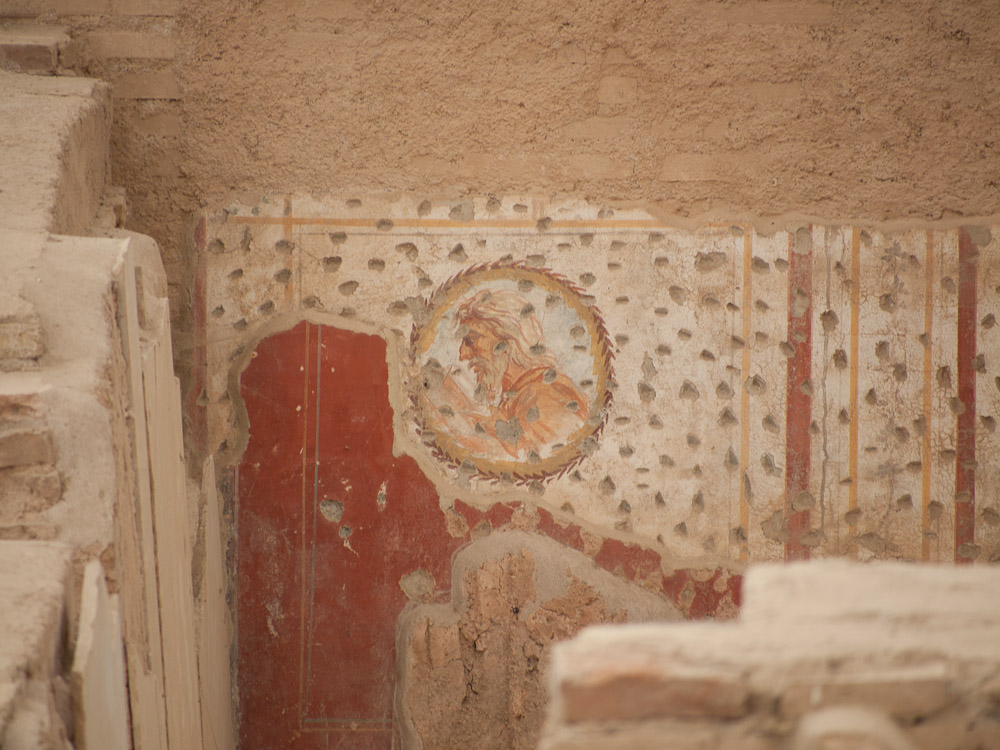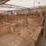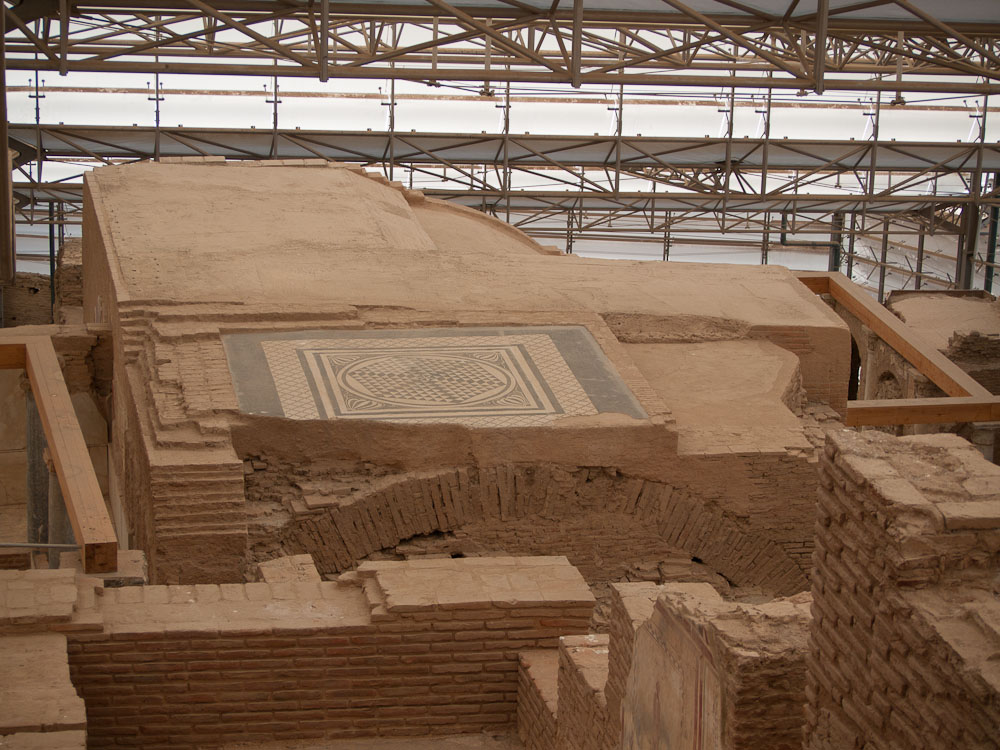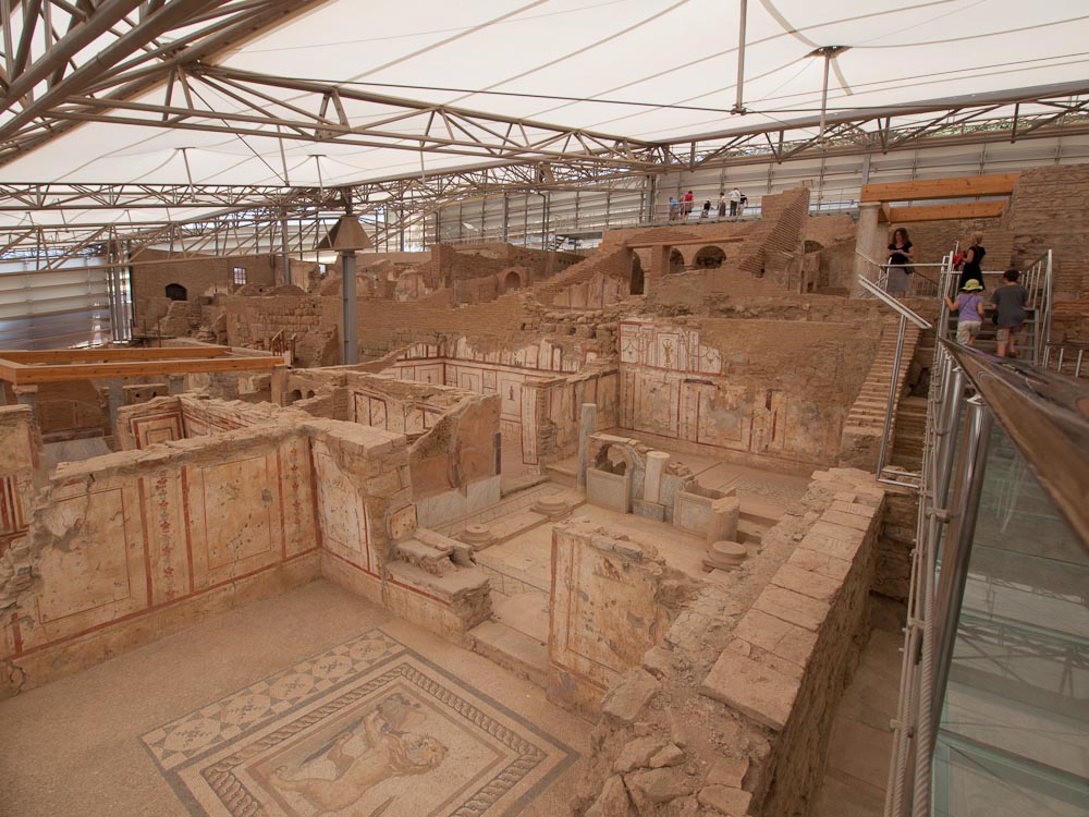 We were all really impressed by these features and especially the mini-museum on the side of the hill. Here they have erected a giant roof, and inside, you can wander through six different Roman apartments. Many of the mosaics and the wall paintings are restored or intact with excellent quality, in contrast to Pompeii where the best ones have been shipped off to museums. Don't miss this, and thanks to Ed Dresner for advising us not to miss it either. As there is active work on this site, it should get better every year.