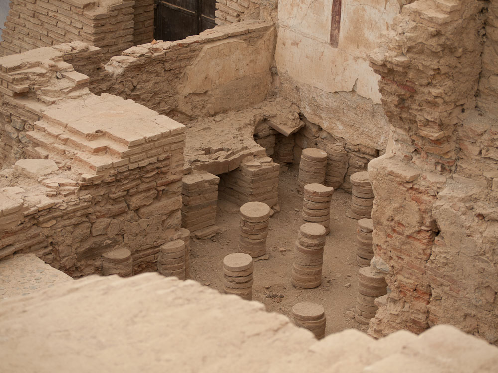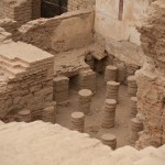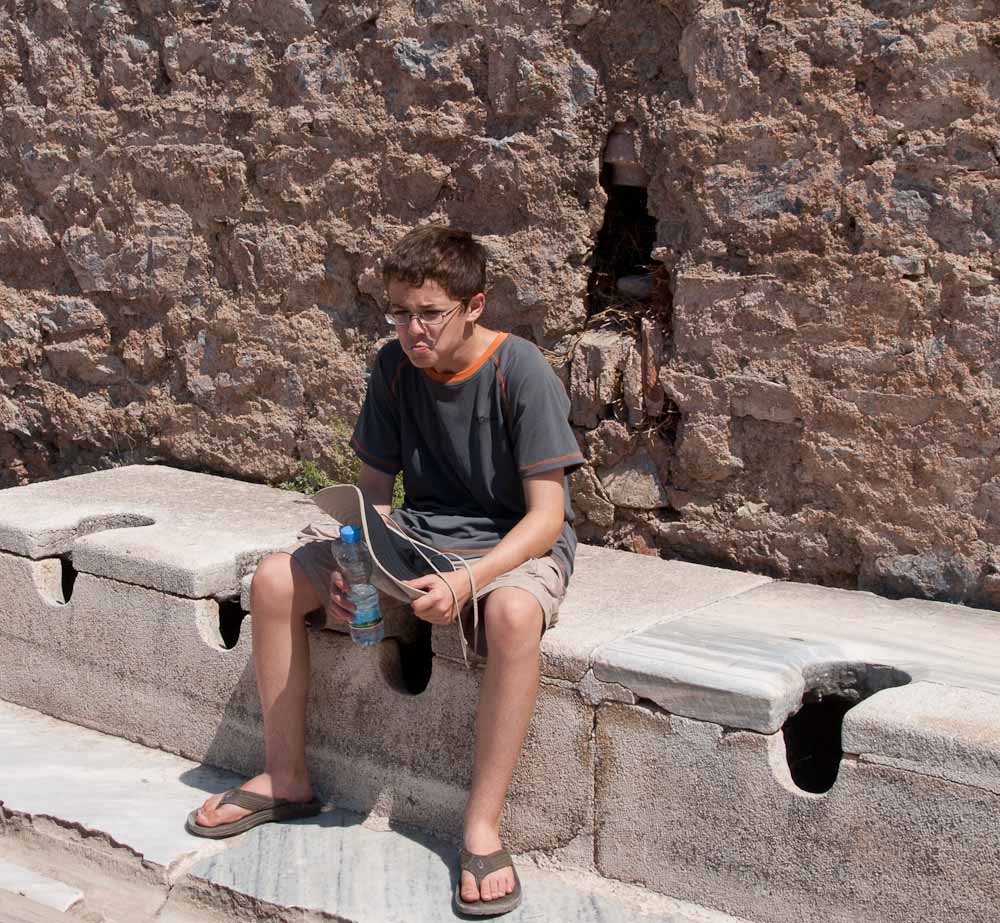 There is a building devoted to public bathrooms here, which was apparently as much a social center as the bath house: at times they played live music here. The seats have no privacy but you do get to sit on marble! Running water about 10 feet below the bench carried away the waste and scent. The story here is that on cold days the wealthy Romans would send a slave to warm up a spot on the marble bench before they arrived.