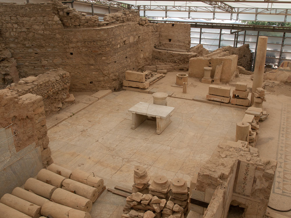 Today Ephesus has many of the features you can see in Roman ruins elsewhere, plus impressive unique features: a huge colisseum seating 25,000; extensive ruins of private houses on the hillsides which are only 15% excavated even today; a public bathroom; tons of terra cotta pipes that were used to bring water all throughout the town; a restored portion of the residential part of town in a mini-museum; and the best of all: the Library of Celsus, which was the world's third largest library in its time. Reputedly, the Library of Alexandria had 400,000 scrolls; the Library of Pergamon had 200,000 scrolls; the Library of Celsus attained third place with just 12,000 scrolls. While the scrolls are gone, this library has an impressive restored facade with a statue of Athena.