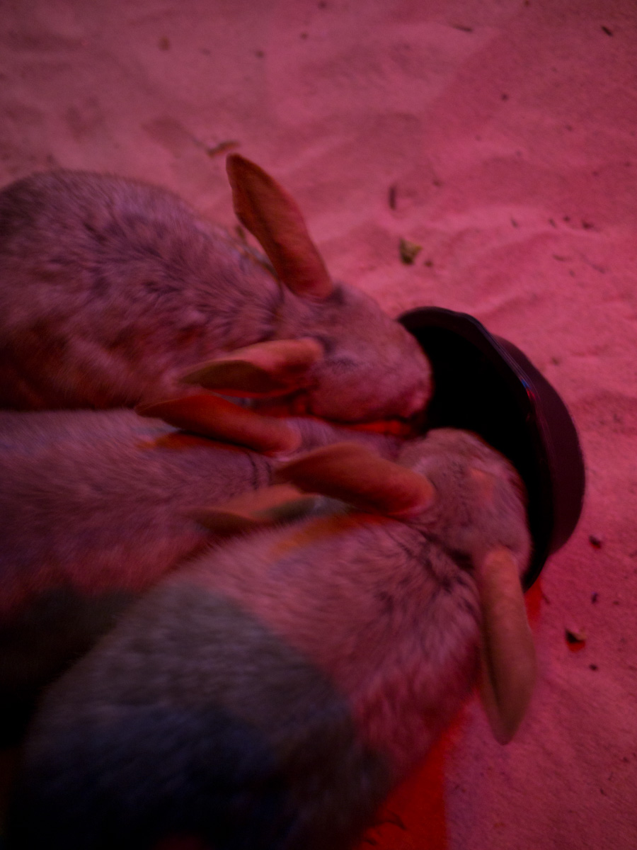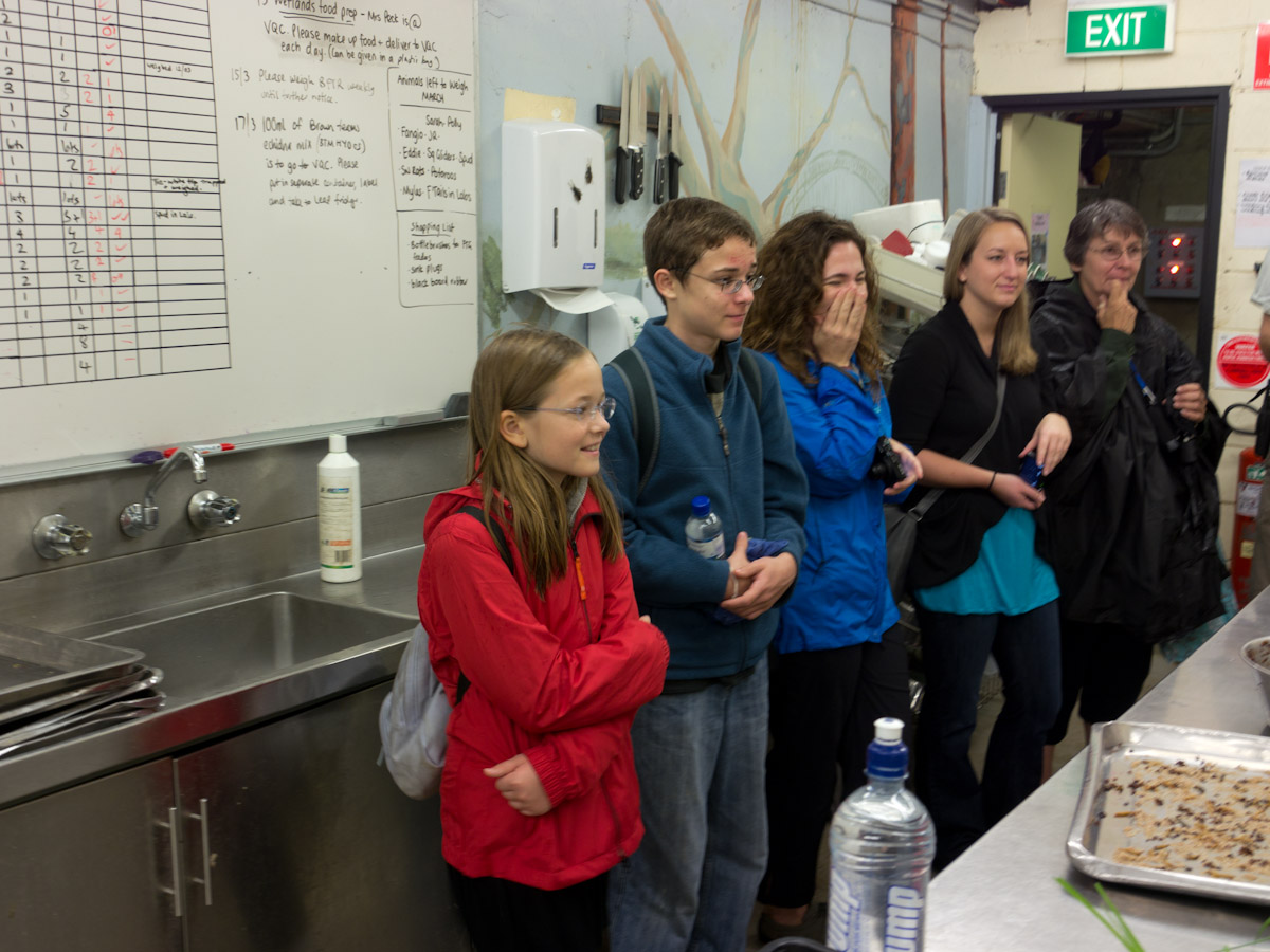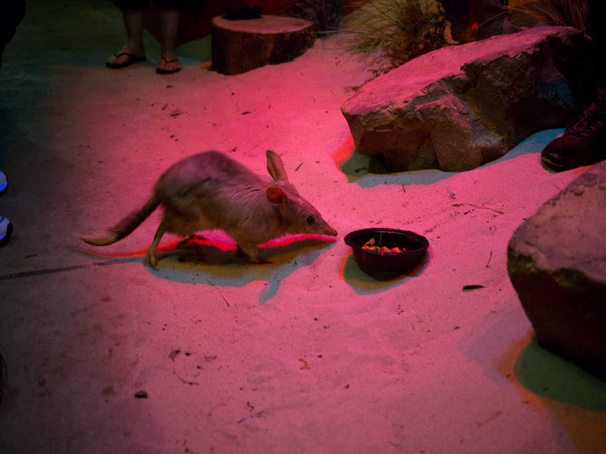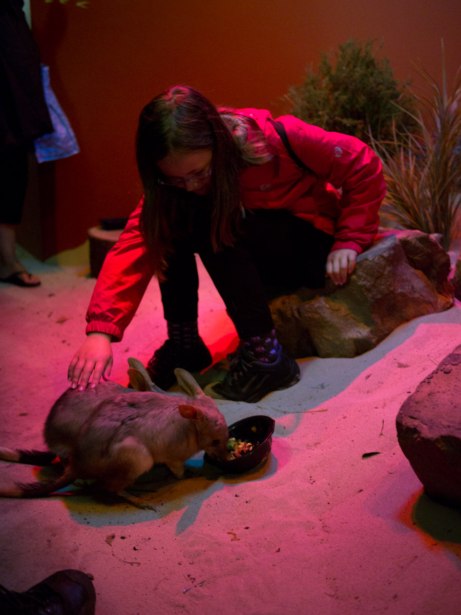 Next was the bilby. We went into a hall and there was a mound of sand with fake plants and rocks. Paul put out bowls of food (which included live worms) and let the bilbies out. They had long noses, furry middles, and tails like a raccoon. We pet them while they ate and when they were done they scurried around our feet.