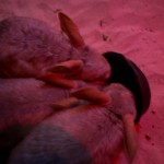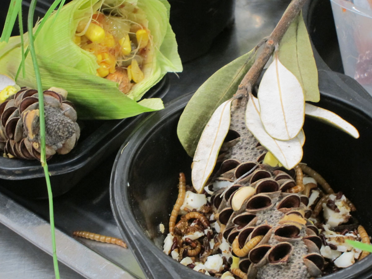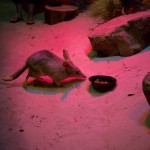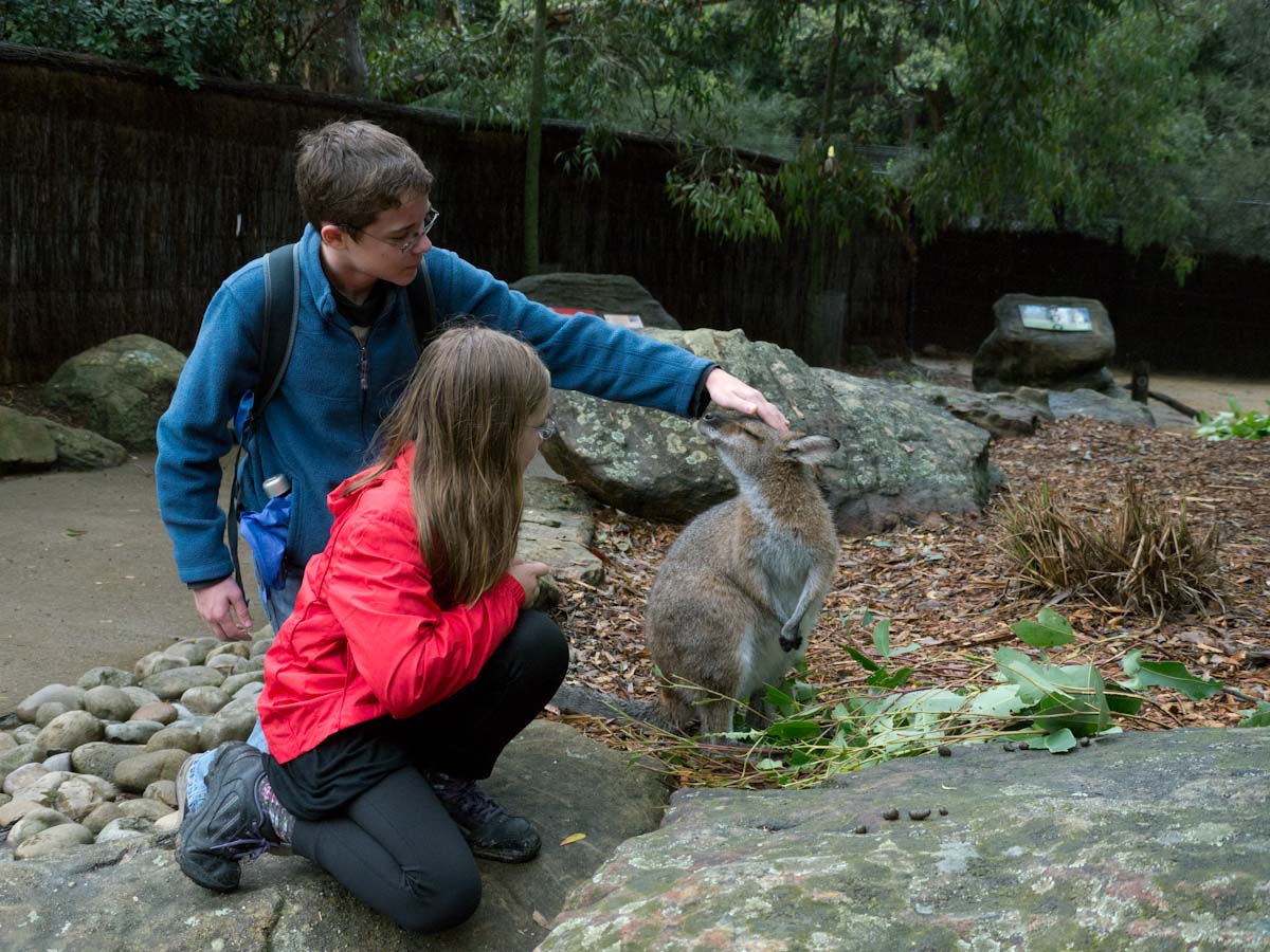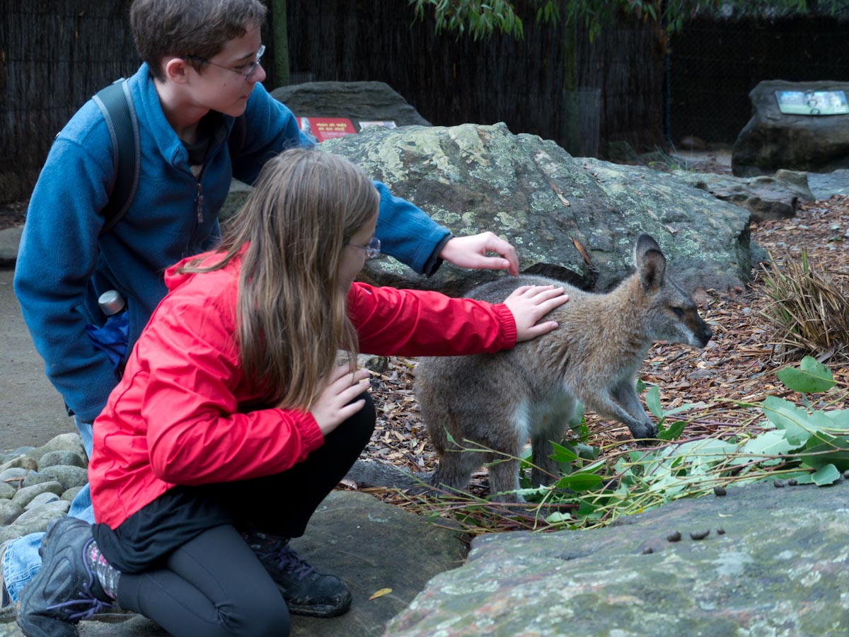 Next was the bilby. We went into a hall and there was a mound of sand with fake plants and rocks. Paul put out bowls of food (which included live worms) and let the bilbies out. They had long noses, furry middles, and tails like a raccoon. We pet them while they ate and when they were done they scurried around our feet.