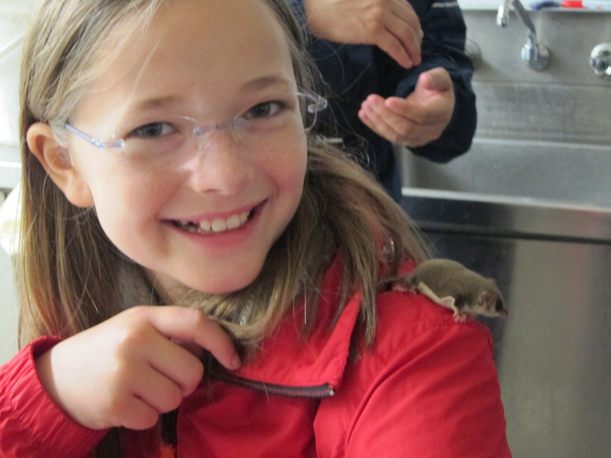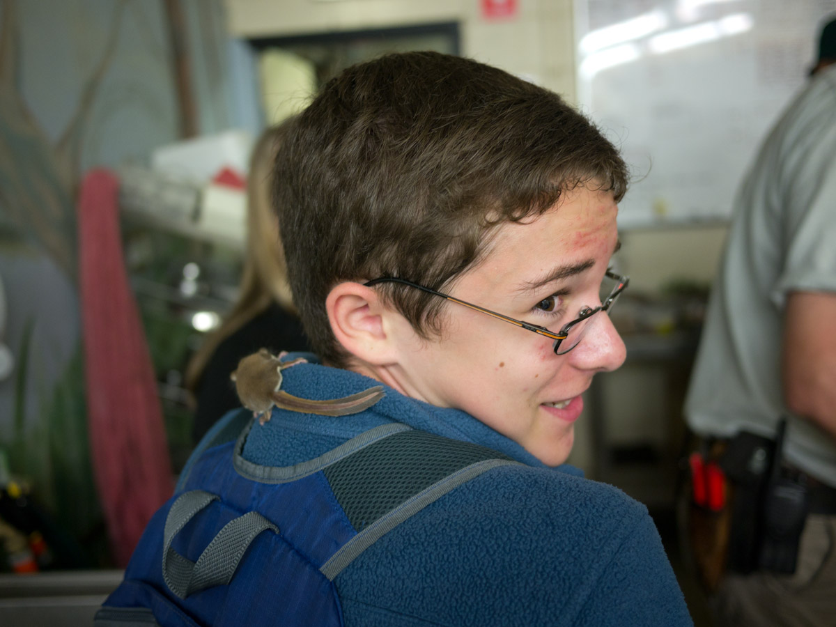 Anyway, back to the feather tail gliders.There were six of them. They look like mice but have a long gray tail that is a mini feather. They are the size of my pinkie. We all held them but they kept running up my arm and into my hood. It really tickled!