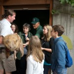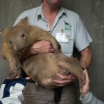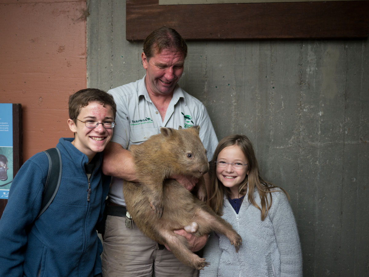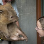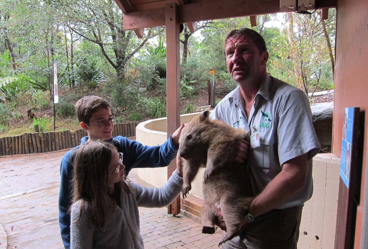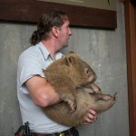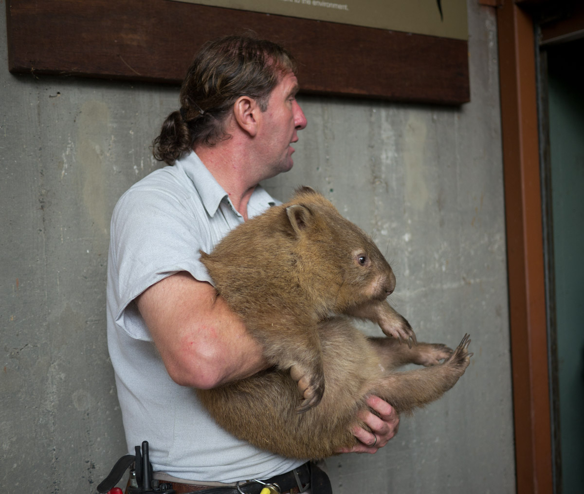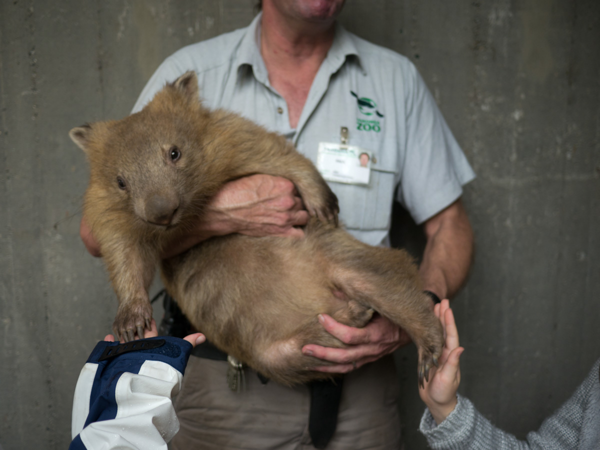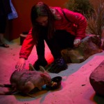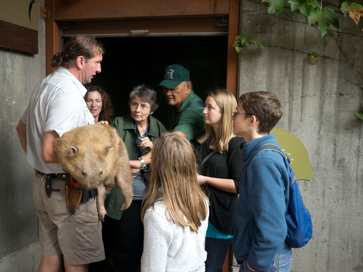 Then, Paul went into a display and brought out a little bear, which turned out to be a wombat. It had sandy fur and big claws. He turned it around and knocked. We heard a thump. Paul explained that a wombat uses its hard back for protection. If something is chasing it, it will go into a hole halfway. Its sturdy back makes an impenetrable door.