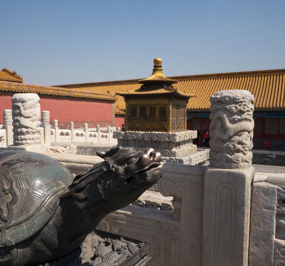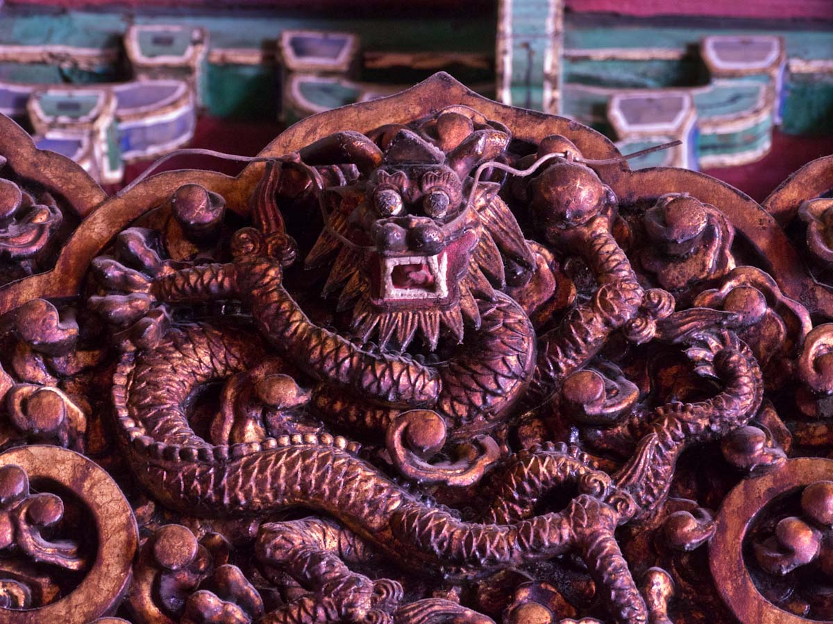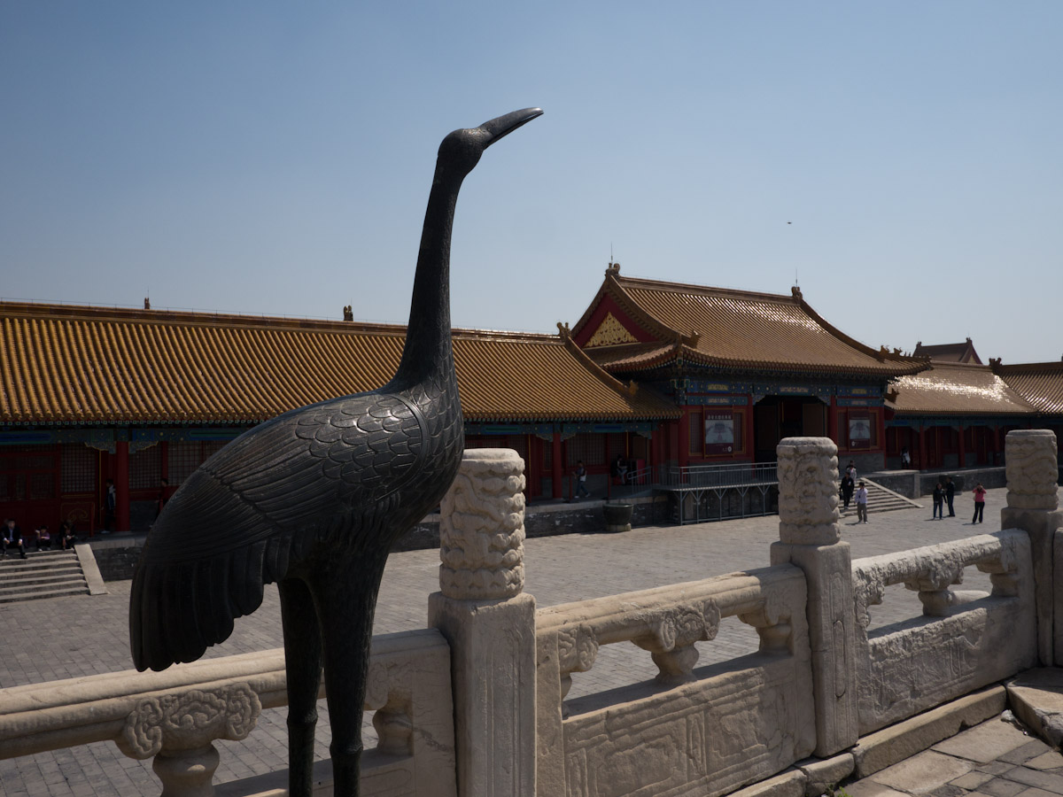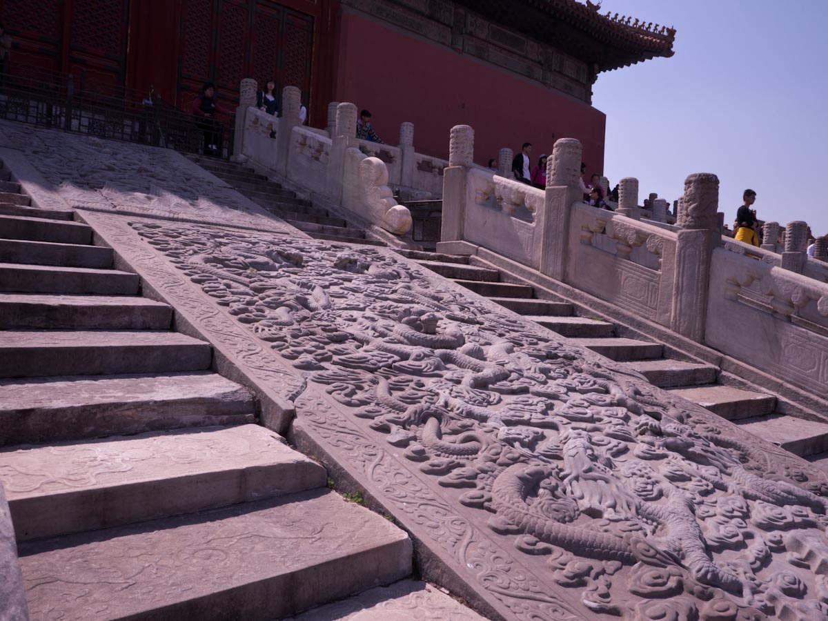Like many palaces, the Forbidden City is laid out in a series of courtyards and grand halls that become progressively smaller and more private as one heads deeper inside. The spaces are vast and there are mythical creatures of many types spread throughout. At the back you can also find large collections of clocks (gifts of foreign powers) and enormous carved jades.