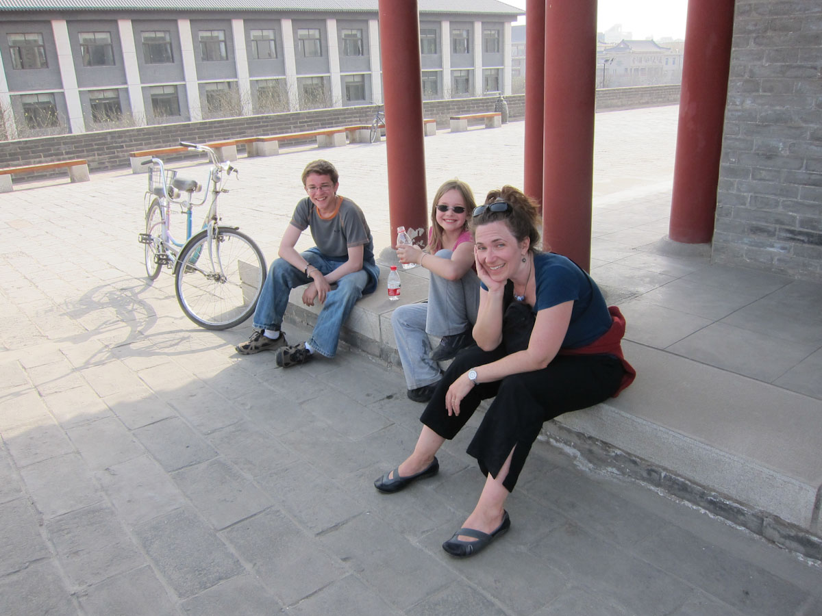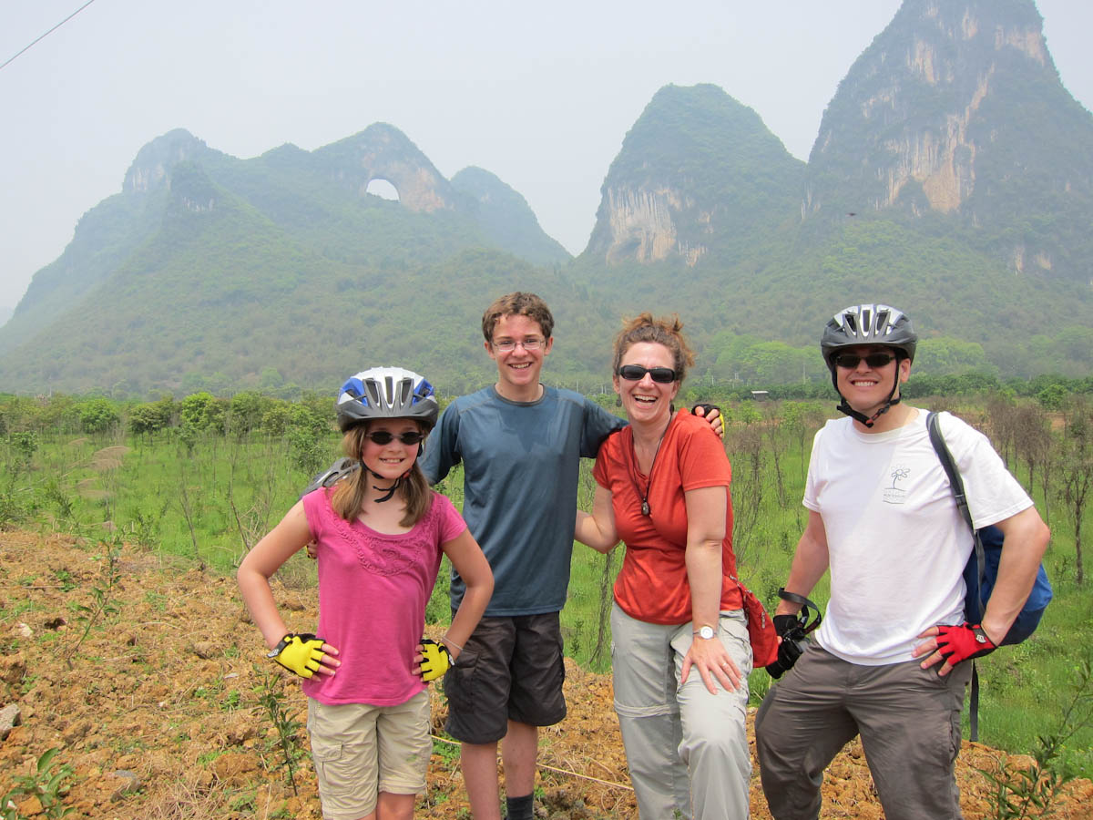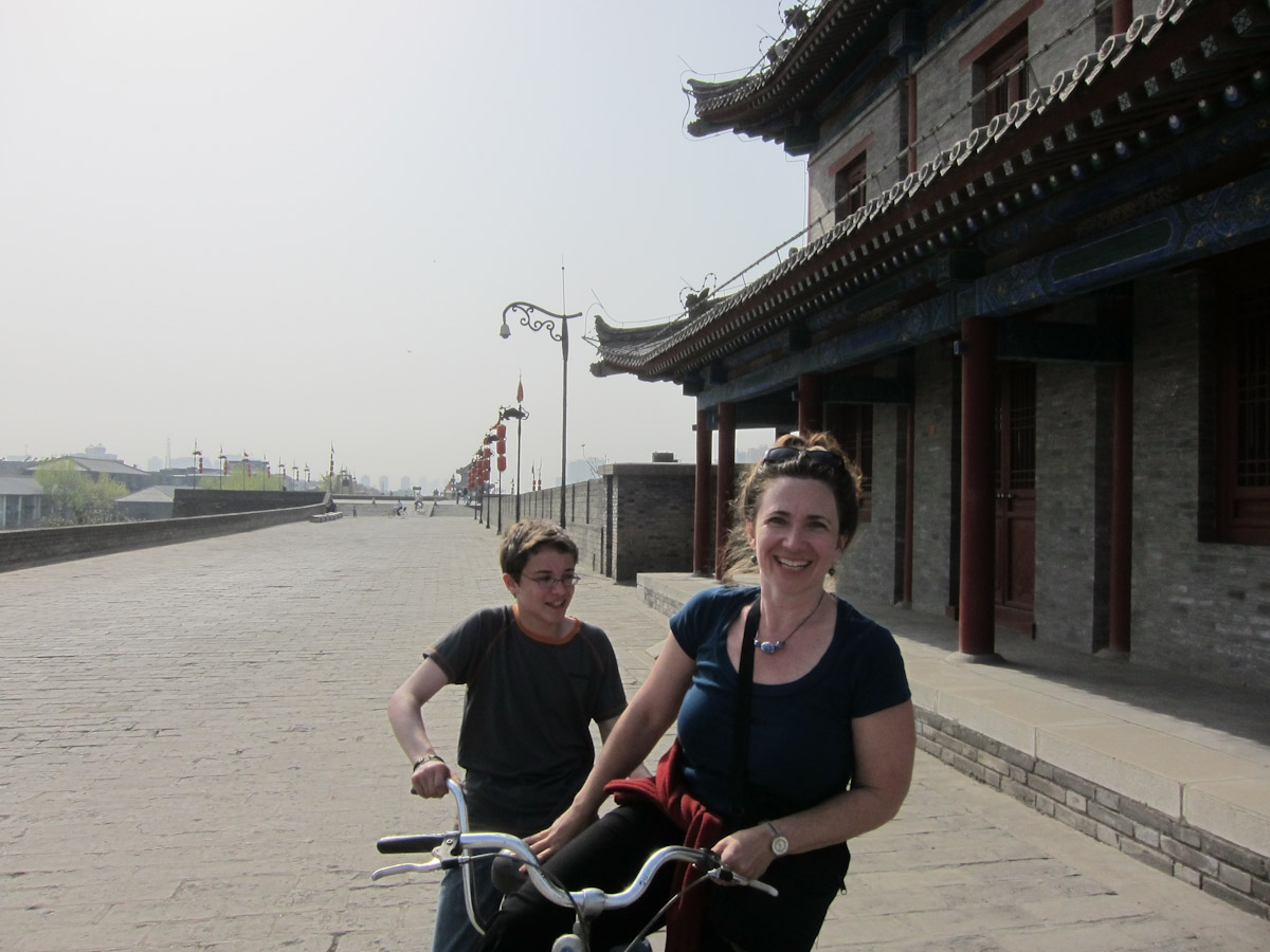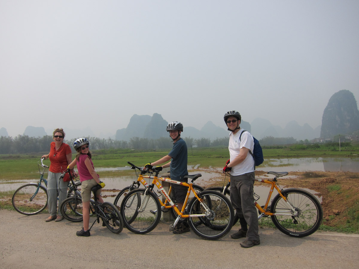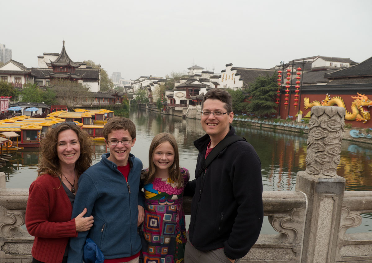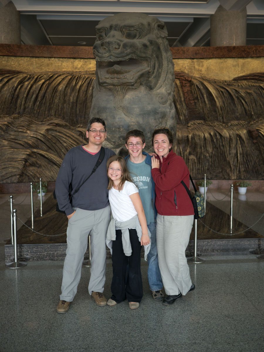 The first stop Xi’an was the original capital of China and is the home of the Terracotta Warriors, a variety of tasty local restaurants and a superb calligraphy school, all described elsewhere. Here we visited the Xi’an Museum to see excellent early pottery, bronzes and sculpture. In Xi’an we could also spend an afternoon tandem-bicycling on top of the old city walls, a 14km circuit around the old town. It was all family fun, until Gina and Carter started to cycle ahead of Katherine and me. “It’s not a race!” we complained. They appeared not to hear and just kept peddling. We looked at each other and worked harder. “It’s not a race!” we cried again. Gina just laughed at us. This would not do; we peddled madly! We built up so much momentum that we dashed past as if they were still. Their jaws dropped open. “It’s not a race… that YOU’RE LOSING!” screamed Katherine over her shoulder. We left them in the dust for the next half hour or so, but the situation changed when we all stopped for a rest break. Gina and Carter left suddenly, piling up a big head start! Katherine and I laboriously caught up and overtook them just 100 meters ahead of the finish line, but with a desperate sprint they recovered and held on to the end. -- After two big cities, it was time for nature. We flew to Guilin and drove to reach rural Yongshuo, a town that has been set aside for nature and tourism – no factories allowed. The Guilin region was once the bottom of an ocean bed, covered in limestone built up from millennia of dead ocean life. When finally exposed to air, the rain eroded all but the purest stone away. What remains are famous Kharst mountains – sudden vertical thrusts of green-covered hills that have inspired countless generations of Chinese artists. The best way to see Yangshuo is to bicycle through the local villages and fields on dirt paths. Our guide Moe took us through. The air was punctuated with the bang! pop-pop-popping sound of firecrackers. It turned out the village was belatedly celebrating tomb-sweeping day, the day when everyone goes back to the tombs of their ancestors to leave offerings and pray for their assistance in the year to come. After leaving a chicken and some symbolic paper money or objects and placing a red flag by the tomb, the villagers set off firecrackers to scare away the demons who would otherwise steal the offerings. Then they parade on to the next ancestor tomb. The tombs of the farmers are usually built of rock and located right at the edge of the field or placed mid-way up on a Karst hill. Decades of Communism may have essentially eradicated organized religion from China, but it could not dislodge this deeply important practice in the rural areas. We had a bit of a scare when Katherine was gazing at the hills and rode right off the dirt path into a farmer’s field where she was unceremoniously dumped off her bike. Luckily she was only scratched up and did not land in the giant pile of manure a few feet away! The ride brought us to Moon Hill, a startling formation that bends over to form an open bridge high in the sky. We completed the 800-step climb with pride only to be humbled to find rock climbers ascending the nearly vertical rocky face of the bridge itself. The other things to see in Guilin are the colorful but touristy streets of Yangshuo and the superbly clear Li River – where you can watch cormorant fishing or take a raft boat ride. All are described elsewhere. -- Nanjing was also once a capital of China. It is smaller and more approachable at 8 million people than Beijing or Shanghai, both 20-25+ million. Out of 280 people on the late-evening flight from Guilin, we were the only Westerners. We had chosen to come here because Nanjing has the largest airport near the E Ink factory. The other foreigners at our hotel all appeared to be businesspeople. Luckily, we connected with an excellent guide named Lily. She brought us round two major sites – Dr. Sun’s Mausoleum (see Katherine’s blog) and the old town center featuring a superb Confucian Temple. Lily knew the history of China so well that we sat enthralled as she brought us through story after story.Dr. Sun’s mausoleum was not just about the 1911 revolution. Here you will also find 2 giant bronze urns, with bullet holes. These are solemn reminders of the Japanese occupation of China and the “Rape of Nanjing.” I watched as a grandmother and mother showed the urn to their baby. There is plenty of anger remaining here still today.