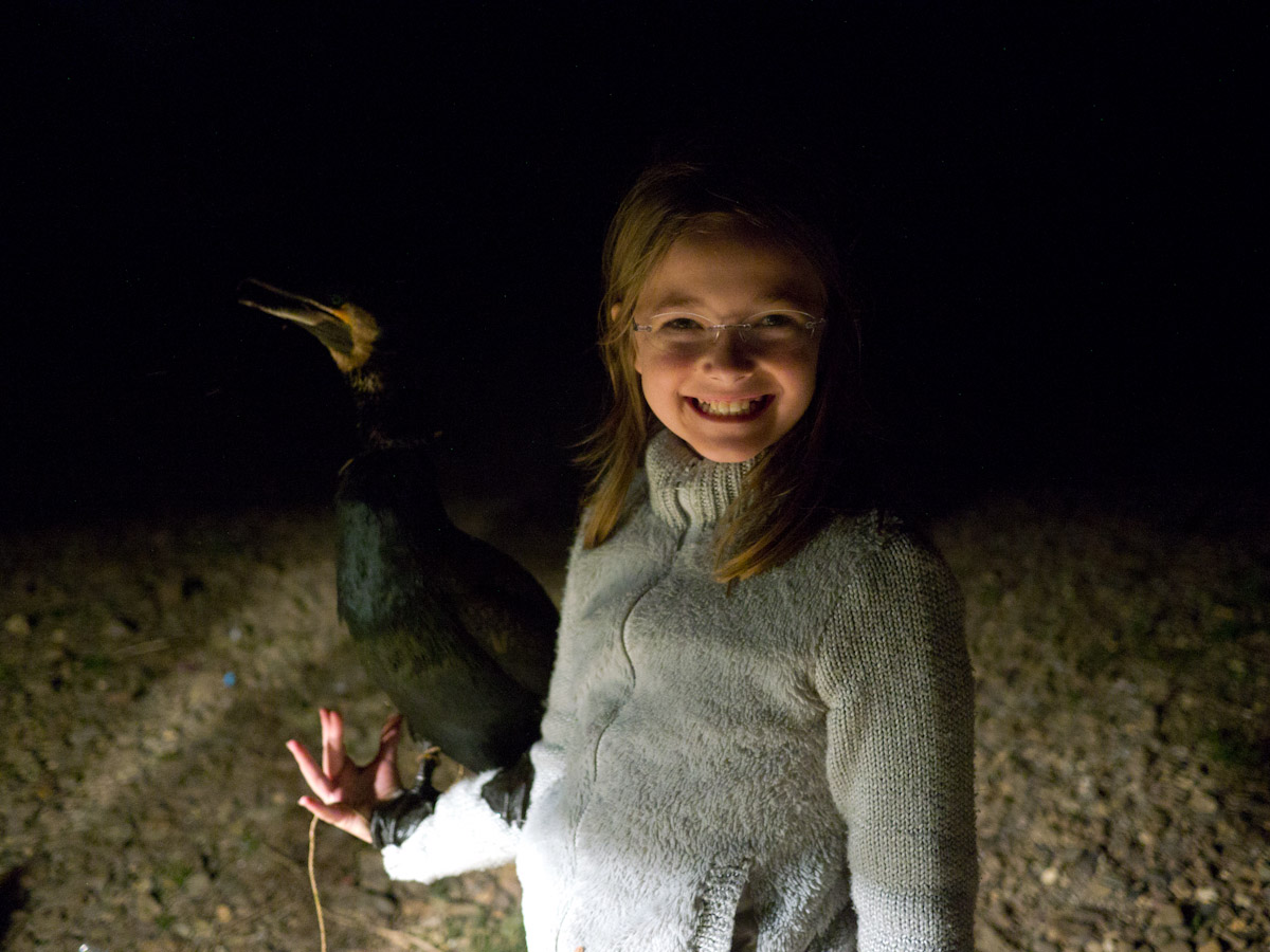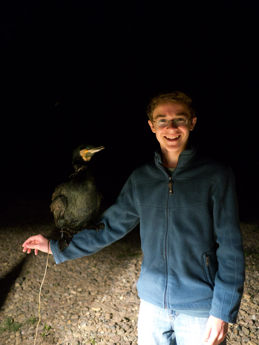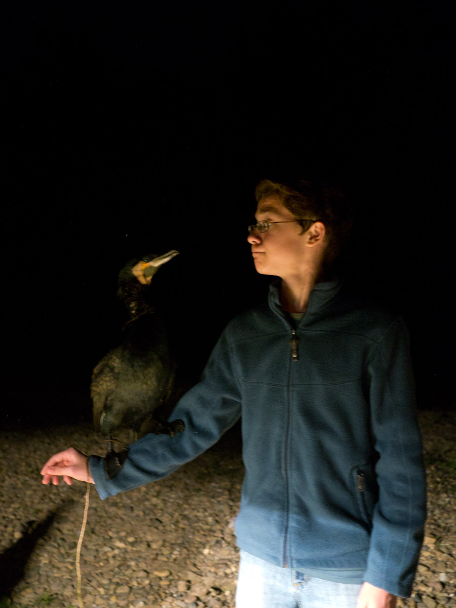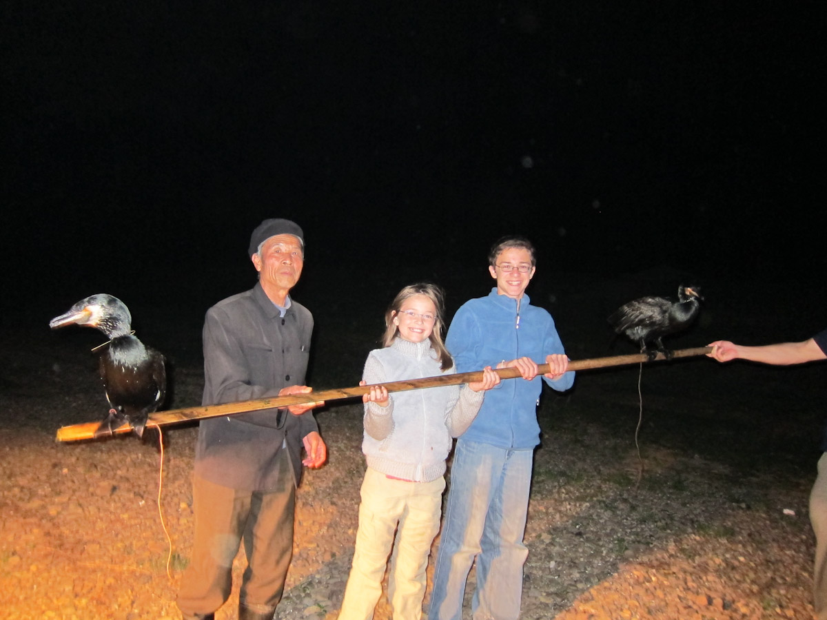 It was around 8:00 pm when we got in the boat and sailed alongside the fishing boat/raft. The fisherman turned a light hanging over a patch of water on to attract the fish. A lot like an angler fish. The birds dived in and swam around with blinding speed. One bird kept tugging on his fellow birds’ ropes. How mean! When the birds were idle or misbehaving the fisherman hit them with his stick. Also how mean! After a while they still hadn’t brought anything up. “I think the fish are so small they can swallow them.” Carter said. I agreed. Just then the fisherman said he’d lost a bird. I vaguely remembered that one bird kept going ahead and figured it was him. Finally the bird was found and we docked a small island covered in green slime. We got off the boat and the fisherman brought both the birds and a big basket over. He took a bird by the neck and forced its mouth open. Six fish fell out and into the basket. We gasped, I had thought they swallowed the fish but really they were just sitting in their throats! When all the throats were empty Carter and I got to hold the bird. They were wet and shook themselves on us but I liked them and petted their backs. Then he tied one of the bird’s foot to one side of his pole. And likewise for the other side. Carter and I held the middle and Dad took a picture. While that happened all the other birds ate the fish in the basket and had to be emptied again. We thanked the fisherman and he went off to do more fishing while we headed back, the cool wind blowing in our faces.