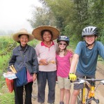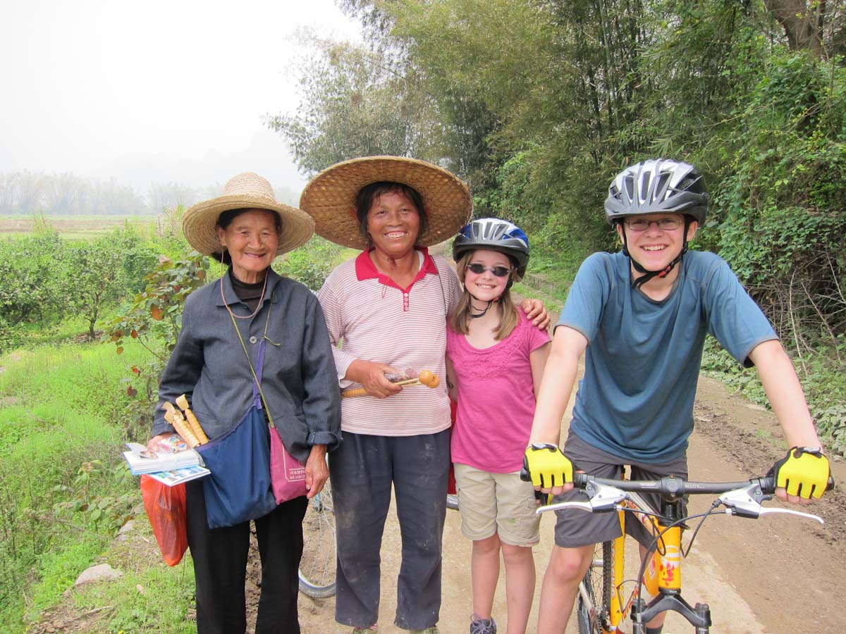 Also in Guilin we took a bicycle ride through the local villages and fields. Two grandmothers saw us ride by and started running after us with postcards and water bottles to sell. We politely said no and kept riding. A while later we slowed down to figure out an intersection. From behind we heard footsteps and yelling– those same ladies were running after us shouting “Hello! Hello!” We kept riding. Ten minutes later the fields opened up to a marvelous view. We had stopped just a moment to take pictures when suddenly a motorscooter (!) pulled up and the first grandmother jumped off the back where she had hitched a ride. She rushed over and started hitting Gina! It turns out she was selling a back massager that looked a bit like salad tongs with wooden knobs on the end. It’s supposed to be soothing. Two minutes later, the second grandmother staggered into view; she had run the whole way on foot. Feeling ashamed at our indifference in the face of their desperation, we paid them $3 for a picture.