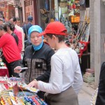 Here are more examples from Xi’an. A man walks up with a box set containing four terra cotta soldiers. He is likely a farmer who has poured local clay into a crude mold and then baked the figures in his backyard. “Just 10 yuan!” Carter wants these so Gina says “OK.” Crafty farmer pulls all four figures out of the box, “Which one you want?” Gina “Didn’t you say ten yuan for the box??” Farmer “Box has four figures. Forty yuan!!” Gina walks away. “OK OK OK. Twenty yuan, whole box!”
