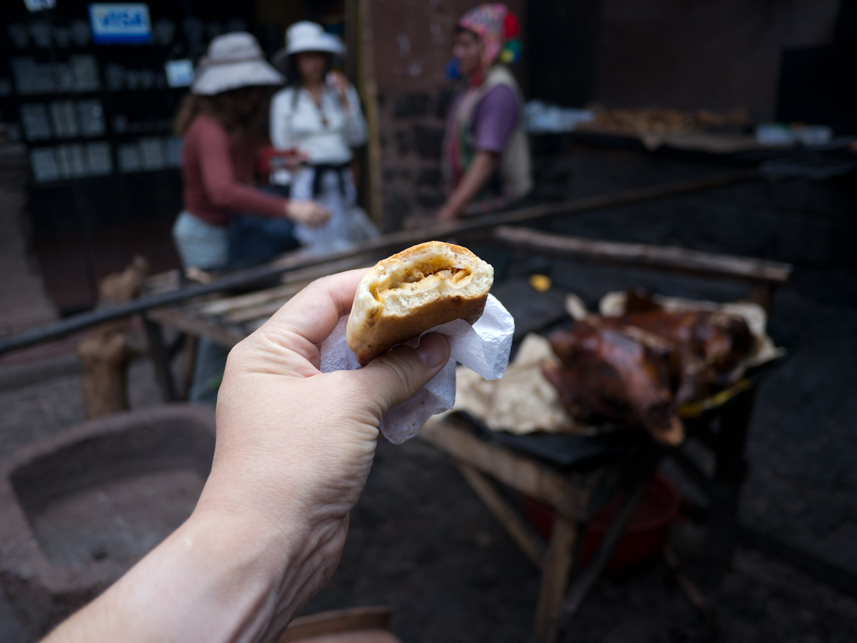 We had one of the tastiest when we visited the weaving center in Chinchero (elevation 3750 meters). There we were offered coca tea and roasted potato wedges. They were prepared simply: just sprinkled with salt and placed near the hot coals of an open fire. The skin was crispy-crunchy, like a chip, and the interior was fluffy and buttery yellow. They were delicious.