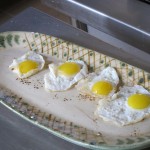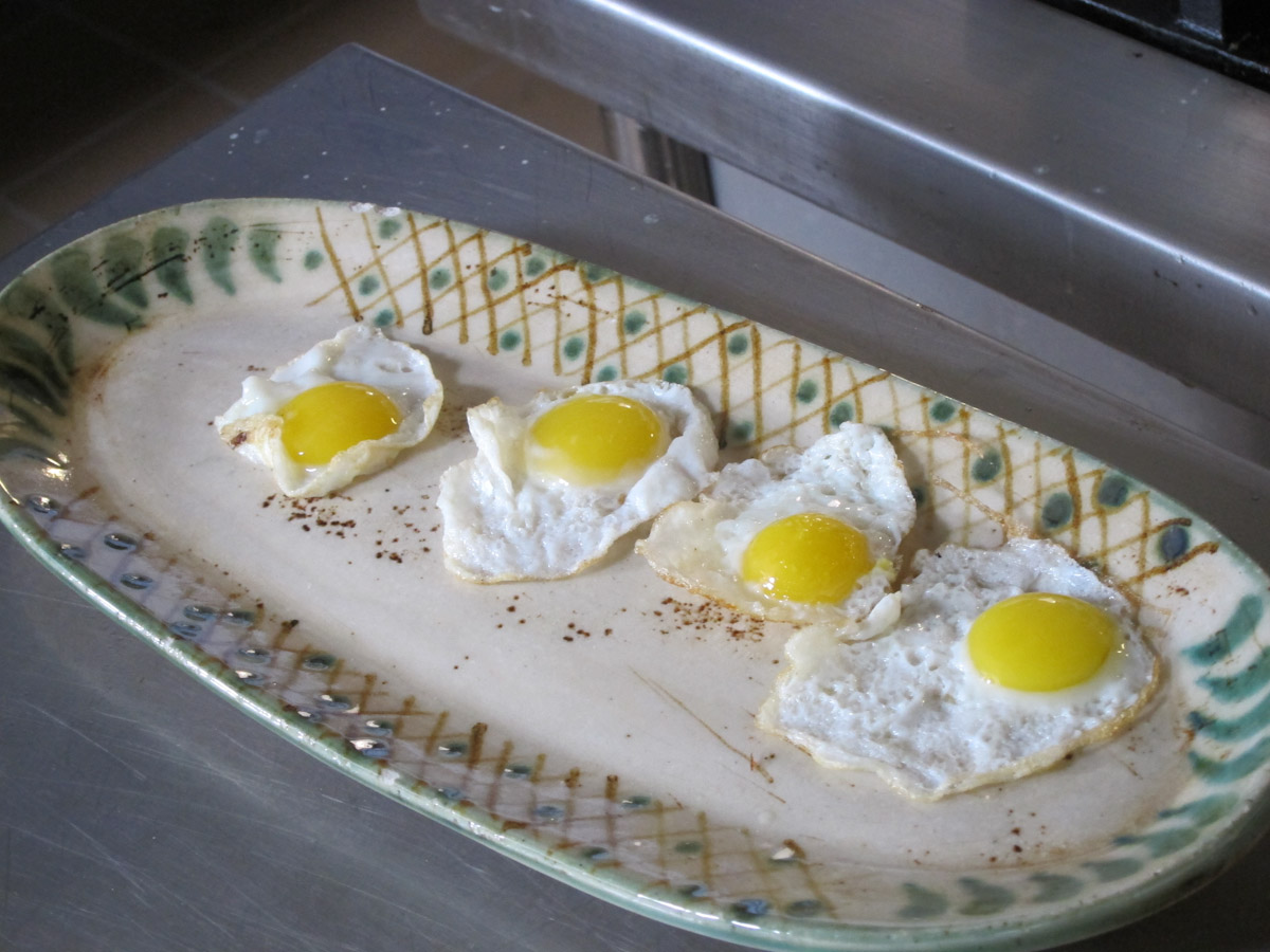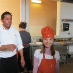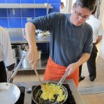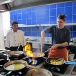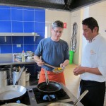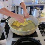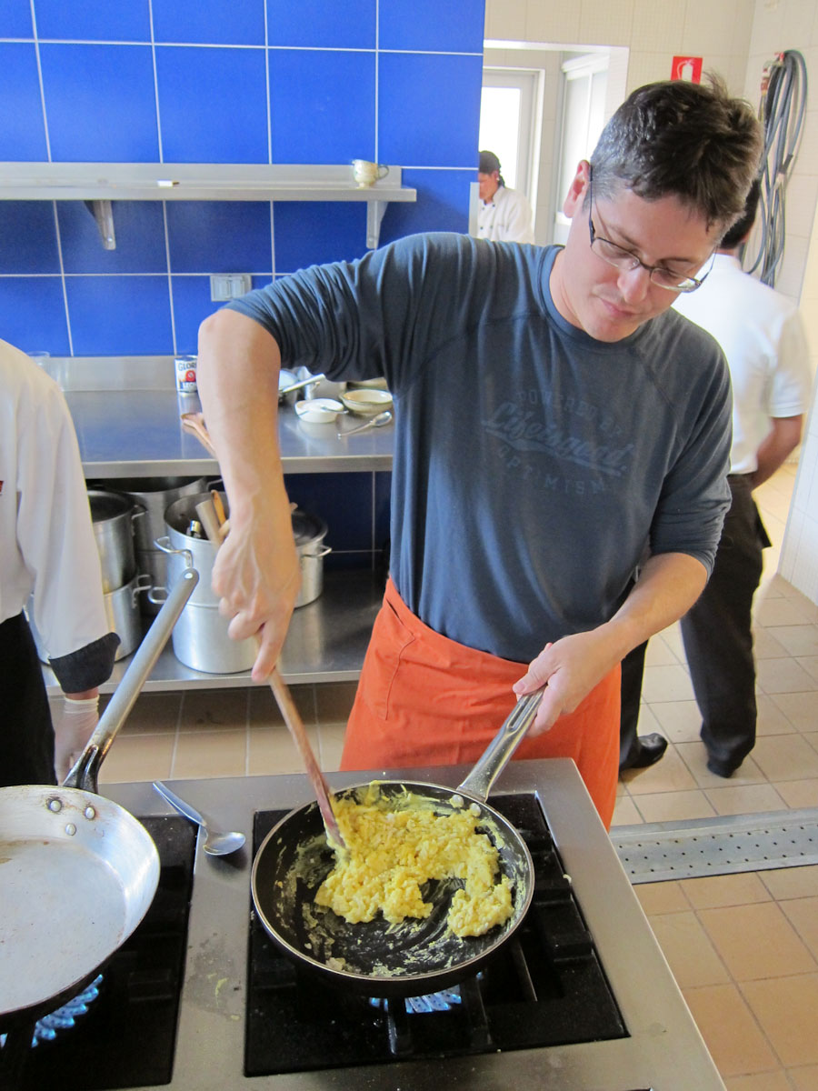 For the truffle dish, you make a basic chocolate truffle (just melt high-grade dark chocolate with butter, cream, and a little liquor, chill, and roll into balls). Then you take the truffle, roll it in a tempura mixture made with flour, sugar, cocoa, salt, yeast, eggs, and water, and DEEP FRY the whole thing for two minutes. The result is a crispy pastry shell exterior and a warm molten chocolate interior. We had them with vanilla ice cream and a passion fruit compote. The result was fabulous and I can’t wait to try this at home.