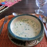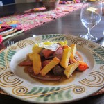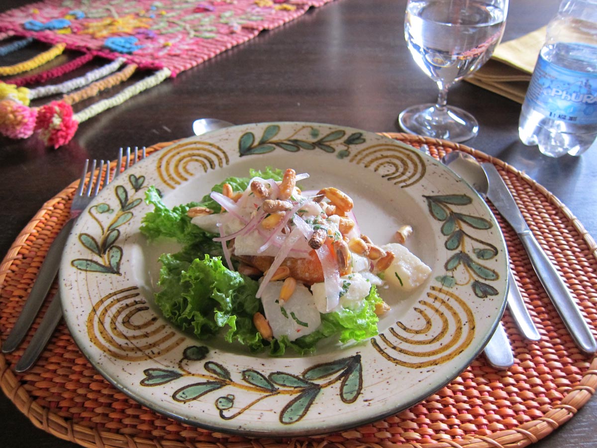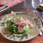 The Peruvians say ceviche only takes minutes to cure and should be served immediately after preparation. Ours was delicious and we enjoyed similar preparations later in Ecuador as well. In a Cusco restaurant we ran into a savory variant called tiradito, where the fish is laid out in strips to make a square. One diagonal of the square is covered in red sauce and another in green, making a colorful presentation that is tasty and light.
